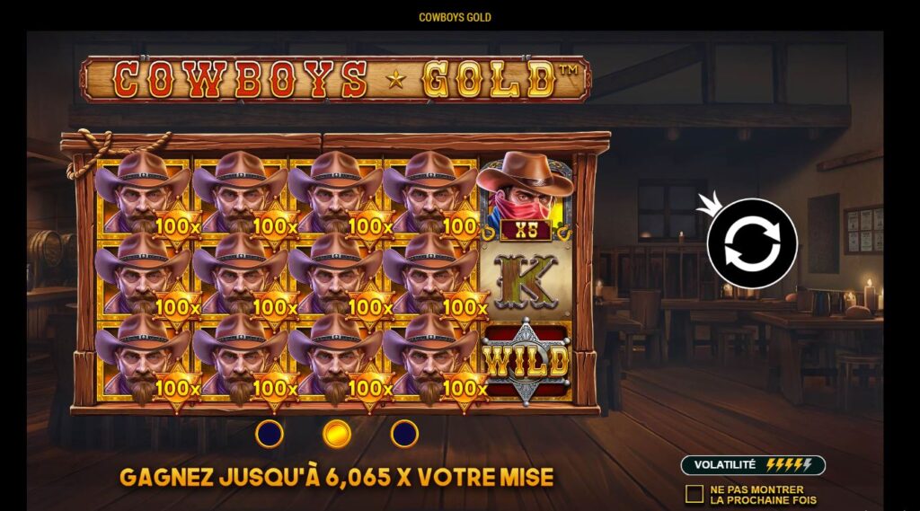 Cowboys Gold est une machine à sous développée et éditée par le fournisseur de jeux en ligne Pragmatic Play. Cette slot nous emmène directement au beau milieu du far west pour assister à une guerre sans merci opposant les cowboys et les bandits. Si vous êtes amateur de westerns, alors Cowboys Gold est la machine à sous qu’il vous faut ! Cowboys Gold nous amène directement au cœur d’un saloon réservant de nombreuses surprises.