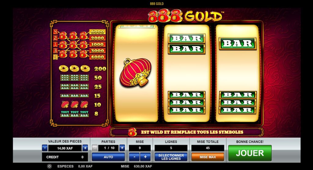 888 Gold est une machine à sous vidéo à trois rouleaux qui bénéficie de 5 lignes de paiement réglables et offre jusqu’à 6 000 fois la mise comme paiement maximum. La machine à sous vidéo 888 Gold propose 8 Wilds, qui peuvent remplacer tous les autres symboles, ce qui permet aux joueurs de décrocher plus facilement des combinaisons gagnantes.