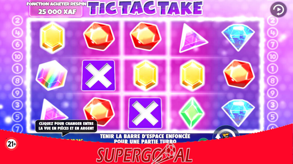 Dans tous les cas, Tic Tac Take est un jeu divertissant créé avec une matrice standard à 5 rouleaux et 10 lignes de paiement fixes. Les utilisateurs apprécieront probablement les graphismes de ce jeu, y compris les symboles brillants aux couleurs très vives et les rouleaux transparents avec des lignes clignotantes. Ils peuvent également voir des points mobiles et des étincelles sur une image de fond violet/rose. Supergooal sans relâche, met à votre disposition et sans contrainte aucune, les jeux et promotions. Vous pouvez faire partie des heureux millionnaires à travers votre compte personnel ! Inscrivez-vous donc sur notre site maintenant et faites-vous sans limite du plaisir, un plaisir responsable !