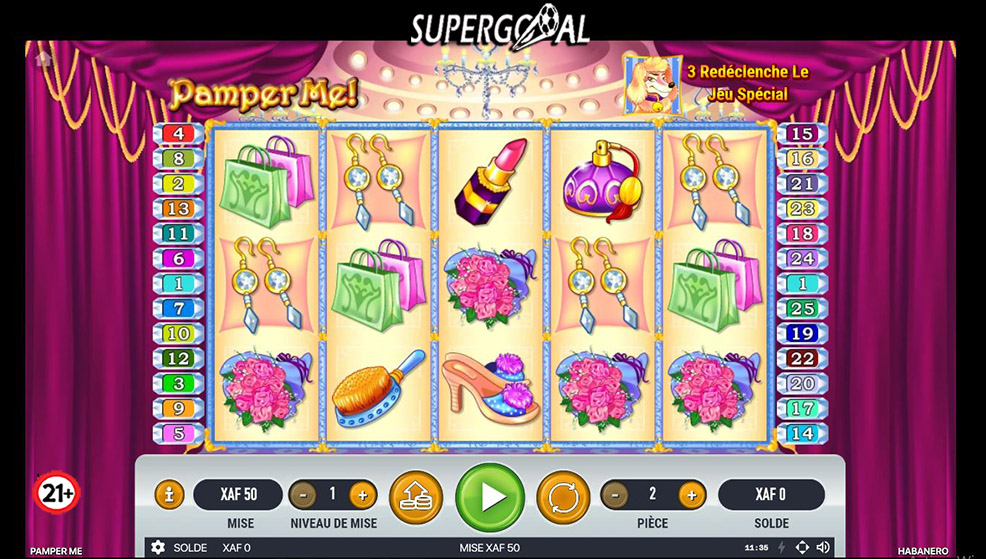 Pamper Me se compose de 5 rouleaux et de 25 lignes de paiement maximum. En tant que joueur, vous pouvez modifier sa mise avant chaque tour. En effet, il peut facilement activer entre 1 et 25 lignes de paiement et investir jusqu’à 10 jetons sur chacune d’entre elles. Supergooal sans relâche, met à votre disposition et sans contrainte aucune, les jeux et promotions. Vous pouvez faire partie des heureux millionnaires à travers votre compte personnel ! Inscrivez-vous donc sur notre site maintenant et faites-vous sans limite du plaisir, un plaisir responsable !