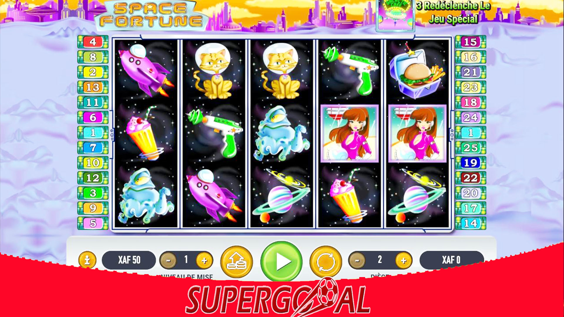 Avec cinq rouleaux et un total de 25 lignes de paiement distinctes, le jeu contient autant de punch que tout ce que vous êtes susceptible de rencontrer ces jours-ci. Et, avec toutes les caractéristiques et fonctions habituelles de dispersion et sauvages que les joueurs de machines à sous attendent de leurs consoles, Space Fortune prend soin de ne pas trop secouer le bateau en termes d’itinéraires qu’il offre à ses joueurs sur leur chemin vers un fortune stable. Supergooal sans relâche, met à votre disposition et sans contrainte aucune, les jeux et promotions. Vous pouvez faire partie des heureux millionnaires à travers votre compte personnel ! Inscrivez-vous donc sur notre site maintenant et faites-vous sans limite du plaisir, un plaisir responsable !