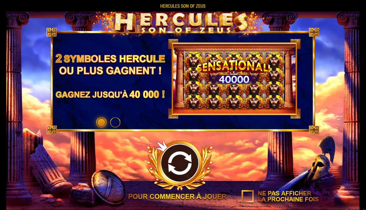 Hercules Son of Zeus bénéficie d’une grande mise en page 5×4 avec 50 lignes de paiement fixes et une gamme de paris allant de 50 à 500 crédits par tour. Les boutons plus et moins à côté du spin switch vous permettront de choisir votre prochaine mise, que vous pourrez placer une ou plusieurs fois de suite grâce au mode de jeu autoplay. Chaque combinaison gagnante déclenche un prix en espèces spécifique, accompagné d’une belle animation 3D sur le dessus. Supergooal sans relâche, met à votre disposition et sans contrainte aucune, les jeux et promotions. Vous pouvez faire partie des heureux millionnaires à travers votre compte personnel ! Inscrivez-vous donc sur notre site maintenant et faites-vous sans limite du plaisir, un plaisir responsable !